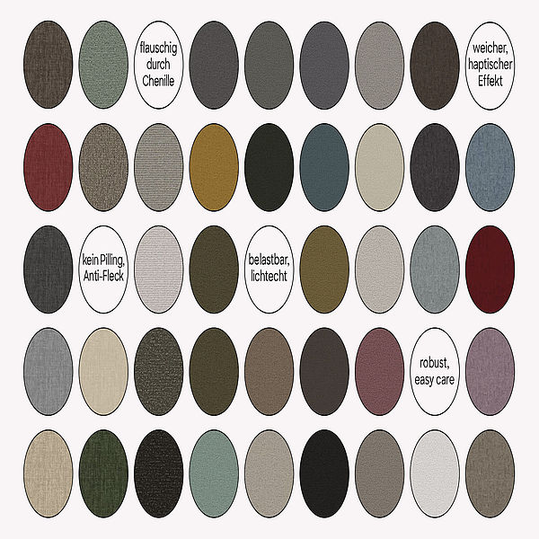 Unsere Stoffe sind sorgfältig ausgewählt und hochwertig verarbeitet. Sie sind robust, lichtecht und pflegeleicht. Jeder Stoff hat seine eigene Haptik und Optik. Von Velours und Mikrofaser über Flockstoffe bis hin zu Flachgeweben – du kannst aus vielen verschiedenen Farben und Haptiken wählen.